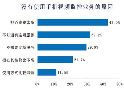 諾達咨詢對沒有使用手機視頻監(jiān)控的用戶原因進行調(diào)查,結(jié)果表明,43%的用戶擔(dān)心資費太高,其次對手機監(jiān)控不了解和不需要此項服務(wù)的用戶各占32%、30%。22%的用戶擔(dān)心性價比不高,12%用戶因為使用比較麻煩而不選擇手機視頻監(jiān)控服務(wù)。