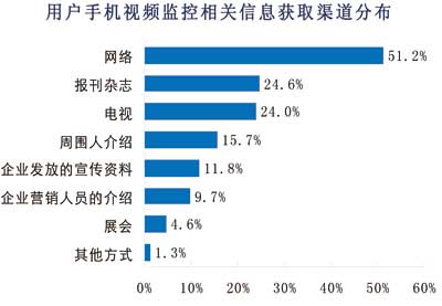 另一方面,運營商的宣傳不到位。從諾達咨詢調(diào)查數(shù)據(jù)來看,用戶目前獲得手機視頻監(jiān)控相關(guān)信息的主要渠道是互聯(lián)網(wǎng),有51%的用戶是通過互聯(lián)網(wǎng)了解手機視頻監(jiān)控的,而從傳統(tǒng)的電視媒體和報刊雜志獲得相關(guān)信息的用戶僅僅約各占24%,通過相關(guān)手機視頻監(jiān)控企業(yè)發(fā)放宣傳資料和介紹獲取相關(guān)信息的用戶各占12%和10%。由此可見,手機視頻監(jiān)控的宣傳尚不到位,導(dǎo)致消費者不能通過多方渠道獲取相關(guān)信息。