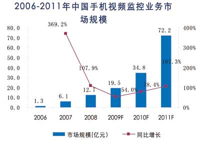 根據(jù)諾達咨詢《手機視頻監(jiān)控市場及用戶行為研究報告2009》研究結(jié)果,2006-2009年為手機監(jiān)控業(yè)務(wù)導(dǎo)入期,2006年手機監(jiān)控業(yè)務(wù)市場規(guī)模達到1.3億人民幣,手機監(jiān)控業(yè)務(wù)的年運營費用自2009年開始,將會逐步下降,目前平均約1000元/年,至2011年將逐步下降到600元/年,設(shè)備費用也將由目前的3000元/點,逐步下降到2011年的1000元/點。