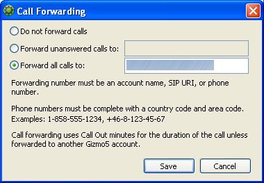 如果你不想用Gizmo5這個(gè)客戶端的話,點(diǎn)擊Edit->Call Forwarding,選擇Forward all calls to,并填寫sip:username@gmail.com,之后所有撥打Google Voice號(hào)碼的電話就都會(huì)被轉(zhuǎn)接到你的Gtalk了。