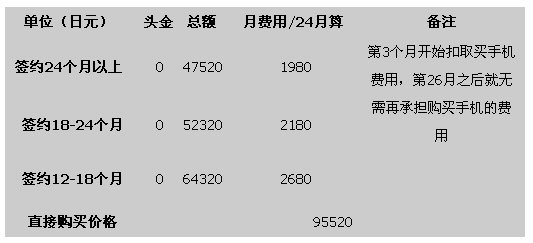 我們都知道日本的購(gòu)買手機(jī)最主要是和運(yùn)營(yíng)商簽約購(gòu)買,我們以夏普2009年夏季最新款手機(jī)Soft Bank 933SH為例,來說明一下在日本購(gòu)買手機(jī)的成本。總的來說,就是簽約時(shí)間越長(zhǎng),購(gòu)買手機(jī)價(jià)格越低,簽約時(shí)間越短,購(gòu)買價(jià)格越高。