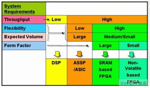 但是ASIC和ASSP帶來(lái)了高昂的非重復(fù)性工程費(fèi)用成本,除非批量非常大。如果只有一小部分用戶使用特殊的功能模塊,那么FPGA解決方案可提供更好的回報(bào)。對(duì)于ASIC和ASSP,這些器件有限的功能和固有的不靈活性,不允許在設(shè)計(jì)完成后根據(jù)市場(chǎng)的要求改進(jìn)或添加新的功能。FPGA卻能提供廣泛的功能和高度的靈活性。