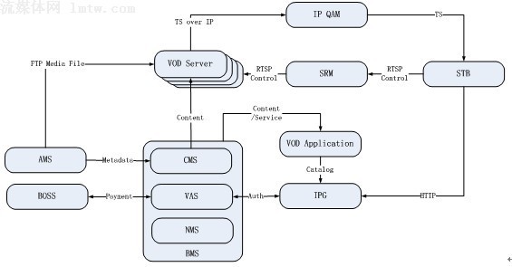一個典型的交互電視系統(tǒng)的功能架構以及后臺管理系統(tǒng)和周邊系統(tǒng)的關系如下圖所示,節(jié)目內容通過AMS媒資管理系統(tǒng)饋入BMS業(yè)務管理系統(tǒng),BMS系統(tǒng)將媒體文件注入到視頻服務器VOD Server,同時將資產(chǎn)注入到業(yè)務應用系統(tǒng)Application,業(yè)務應用系統(tǒng)進行節(jié)目編排和服務綁定后再發(fā)布到互動節(jié)目導航系統(tǒng)IPG。用戶通過導航界面來選擇點播的節(jié)目,同時會話資源管理系統(tǒng)SRM 和BMS平臺在后臺工作以管理網(wǎng)絡帶寬,并與付費平臺配合確定用戶帳戶的合法性。
