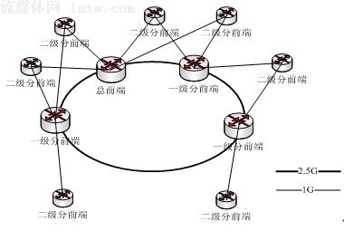 某廣電現(xiàn)有網(wǎng)絡環(huán)境如下圖所示,總前端及其他一級分前端處于骨干光纖環(huán)網(wǎng)上,另有若干個二級分前端分別通過光纖雙上聯(lián)至骨干環(huán)網(wǎng)上的總前端或一級分前端中的兩個物理節(jié)點。所有物理節(jié)點均帶有一定數(shù)量的終端用戶。