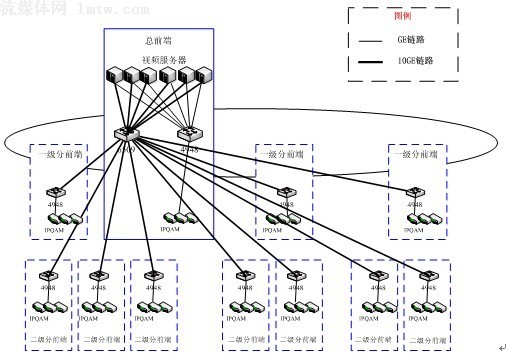 方案二:全集中式。在總前端集中部署若干臺視頻服務器,通過萬兆網(wǎng)絡直接向各分前端提供視頻流服務;示意圖如下: