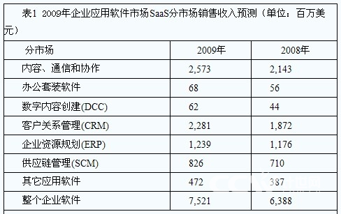 在Gartner的統(tǒng)計中,SaaS領域中,除了CRM之外,內容、通訊和協(xié)作市場同樣表現(xiàn)不俗,在2009年,這一市場的銷售收入將從2008年的21.4億美元增長到26億美元,甚至超過了CRM分市場的23億美元。其他如ERP分市場等同樣占據(jù)不小的份額。