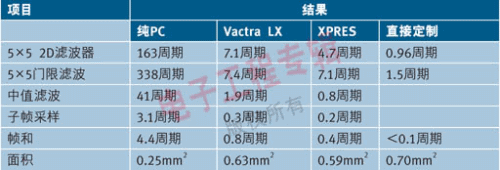 表1中“XPRES”列所示為采用Tensilica自動化工具XPRES定制的處理器執(zhí)行5種算法的性能。