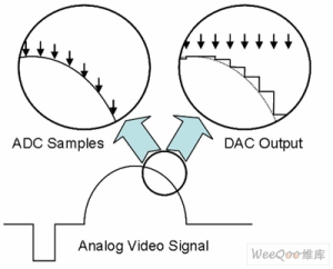 由攝像機(jī)或其他設(shè)備捕獲的模擬視頻信號(hào)通過模/數(shù)轉(zhuǎn)換器(ADC)進(jìn)行數(shù)字化處理,它在每個(gè)時(shí)鐘邊沿即時(shí)記錄數(shù)據(jù)(圖2)。模擬信號(hào)連續(xù)變化,而轉(zhuǎn)換成數(shù)字信號(hào)時(shí)則是定時(shí)采樣。經(jīng)過數(shù)字處理和傳輸后,數(shù)字信號(hào)通過數(shù)/模轉(zhuǎn)換器(DAC)轉(zhuǎn)變成模擬信號(hào)。DAC的輸出如圖2的右上角所示,箭頭代表時(shí)鐘信號(hào)。