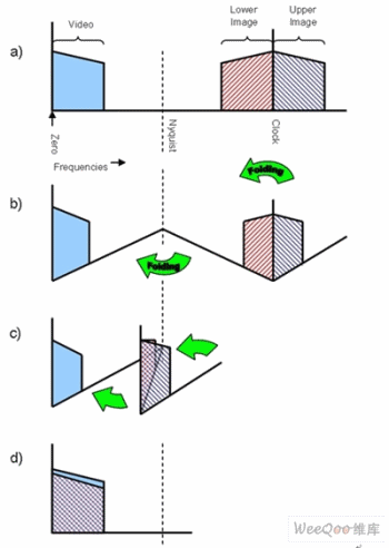 從圖5可以看出重建濾波器的作用,利用參考書中提供的定理可以很容易理解頻譜混疊。通常,在頻域,頻率和放大倍數(shù)都采用對(duì)數(shù)刻度,重建濾波器的頻響特性表現(xiàn)為平滑曲線。然而,為了說明邊帶重疊的位置,我們用線性坐標(biāo)表示頻率和放大倍數(shù)。為了表示低通濾波器在同樣刻度坐標(biāo)下的衰減特性,從濾波器頻響曲線可以看出:對(duì)于有用的視頻信號(hào)衰減很少,對(duì)于鏡像頻率衰減較大。圖5b和5c顯示了混疊效應(yīng),但是應(yīng)該注意到,與圖3d相比,圖5d中的鏡像頻率被顯著衰減。