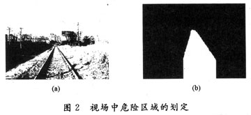 圖像二值化后的結(jié)果如圖2(a)所示,得到的最終結(jié)果如圖2(b)所示。從兩幅圖像的對比可以看出,圖像經(jīng)過一系列處理后,基本標(biāo)定了危險區(qū)域。對于得到的圖2(b),圖中白色的區(qū)域?yàn)殍F道雙軌內(nèi)部即設(shè)定的危險區(qū)域。應(yīng)用此種方法得到的結(jié)果圖像在光照條件充足情況下能夠得到更好的效果,不適用于光照條件不足和夜間的危險區(qū)域標(biāo)定。