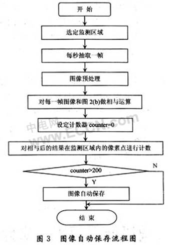 對每一幀都做上述處理,經(jīng)過一段時間的監(jiān)測后,系統(tǒng)會自動保存一些危險情況存在時的圖像(灰度圖形式)。圖像自動保存方法流程圖如圖3所示。