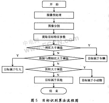 根據(jù)運(yùn)動目標(biāo)的分類可知,車輛的周長是最長的,所以首先直接判斷圖像中運(yùn)動目標(biāo)的周長,如果大于某一設(shè)定好的閾值,則可輕易判斷出視場中目標(biāo)屬于車輛。余下的目標(biāo)中,行人比小動物的縱橫軸比值大,設(shè)定縱橫軸比閾值,據(jù)此可以判斷出目標(biāo)屬于行人。最后將設(shè)定一個面積閾值,面積大于此閾值則可判斷目標(biāo)屬于小動物,否則目標(biāo)屬于其他一些環(huán)境的干擾。