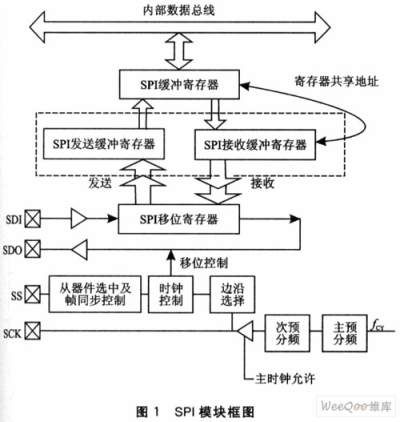 dsPIC30F6014提供了2個SPI接口模塊,每個接口模塊包括三個特殊功能寄存器和四個引腳。SPIxBUF是數(shù)據(jù)緩沖寄存器。需要注意的是,接收緩沖SPIxRBF和發(fā)送緩沖SPIxTBF共享同一個地址,即它們都是地址映射到SPIxBUF的。也就是說,當(dāng)對接收或發(fā)送緩沖寄存器操作時,都只能對SPIxBUF進(jìn)行操作,而不能直接對SPIxRBF或SPIxTBF進(jìn)行操作。SPIxCON是控制寄存器,用來對sPI模塊的操作模式等進(jìn)行配置;SPIxSTAT是狀態(tài)寄存器,用來標(biāo)示SPI模塊所處的狀態(tài)。其模塊框圖如圖1所示。