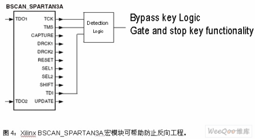 平臺(tái)中, 可在設(shè)計(jì)中使用BSCAN_SPARTAN3A宏模塊,其檢測邏輯可監(jiān)控FPGA構(gòu)造中的JTAG控制信號(hào),如圖4所示。如果檢測到JTAG控制信號(hào)的活動(dòng),用戶在設(shè)計(jì)可以立即繞過關(guān)鍵邏輯或關(guān)斷關(guān)鍵功能,不再執(zhí)行正確的功能。這樣反向工程人員讀到的將是不正確的功能模塊,在不能完成預(yù)期功能的解決方案上浪費(fèi)時(shí)間和資源。