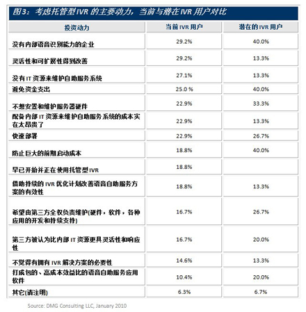 圖3顯示了現(xiàn)有和潛在的語音自助服務(wù)用戶尋求托管型IVR的主要?jiǎng)恿碓。潛在客戶認(rèn)真考慮托管型IVR解決方案的兩個(gè)很明顯的原因是避免大的資金開銷和最小化啟動(dòng)成本,在經(jīng)濟(jì)不景氣時(shí)這樣的做法并不令人意外。另外還有個(gè)原因是希望一邊使用該方案一邊積累經(jīng)驗(yàn)和知識(shí)。