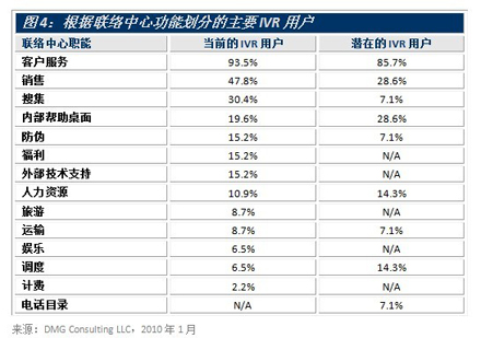 圖4根據(jù)職能對(duì)現(xiàn)有和潛在的主要IVR用戶進(jìn)行了區(qū)分。客戶服務(wù)和銷售聯(lián)絡(luò)中心是最上層的IVR用戶,分別占現(xiàn)有用戶量的93.5%和47.8%,占潛在用戶量的85.7%和28.6%。