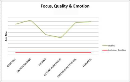 第二張圖片中客戶在很生氣的狀態(tài)下開始呼叫,而代理除了幫助階段外表現(xiàn)得都很好。該代理執(zhí)行的是最低績效標準,但他對客戶的影響卻等于零。分析師提出了一個非常明顯而重要的關(guān)節(jié)——幫助是整個呼叫中最為重要的環(huán)節(jié)。這就是我們要做的事情。如果在幫助這一環(huán)上沒做好,那么其它環(huán)節(jié)如感謝客戶、問候客戶等等都變得無足輕重。