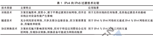 每種過渡技術(shù)都有一定的適用場景,過渡技術(shù)的選擇,不僅要關(guān)注過渡過程對(duì)用戶體驗(yàn)的影響,還應(yīng)考慮網(wǎng)絡(luò)、終端和平臺(tái)的改造成本以及技術(shù)演進(jìn)的復(fù)雜性。從表1可以看出,作為其他過渡技術(shù)的基礎(chǔ),雙棧技術(shù)是實(shí)現(xiàn)IPv6節(jié)點(diǎn)與IPv4節(jié)點(diǎn)兼容的最直接方式,因此,在三網(wǎng)融合環(huán)境下,應(yīng)遵照雙棧技術(shù)為主和其他過渡技術(shù)為輔的原則,針對(duì)不同企業(yè)的網(wǎng)絡(luò)及業(yè)務(wù)現(xiàn)狀,靈活調(diào)整策略,實(shí)現(xiàn)IPv6的引入。