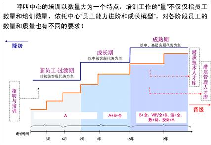 業(yè)務(wù)模塊化后,客服中心對一線客服代表進(jìn)行分級(jí)認(rèn)證,針對簡單業(yè)務(wù)和復(fù)雜業(yè)務(wù)分別設(shè)置首層和二線專席兩類共計(jì)8種人員承接梯隊(duì),達(dá)到業(yè)務(wù)與人員的全匹配。人員梯隊(duì)的設(shè)置對人員的培訓(xùn)管理和進(jìn)出機(jī)制提出了新的挑戰(zhàn),如何科學(xué)界定不同隊(duì)列人員的技能標(biāo)準(zhǔn)?如何設(shè)置不同成長時(shí)期員工的進(jìn)出管理機(jī)制?