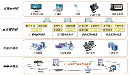 目前用戶是通過電視+機頂盒的方式享受廣電運營商提供的數(shù)字電視服務(wù),而未來用戶可通過計算機、手機、VOIP終端、家庭信息機等多樣化的終端訪問廣電運營商所提供的寬帶接入服務(wù)、VOIP的語音服務(wù)、各種信息化應(yīng)用服務(wù)。