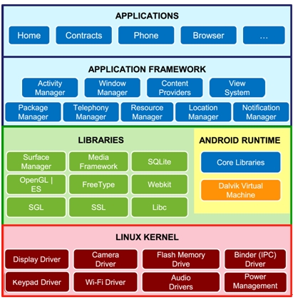 系統(tǒng)函式庫(kù)(Library):使用C/C++函式庫(kù)的系統(tǒng)組件以供呼叫使用,開發(fā)者可透過上層的應(yīng)用程序框架來運(yùn)用這些功能,這也是主要Android設(shè)備的效能關(guān)鍵。