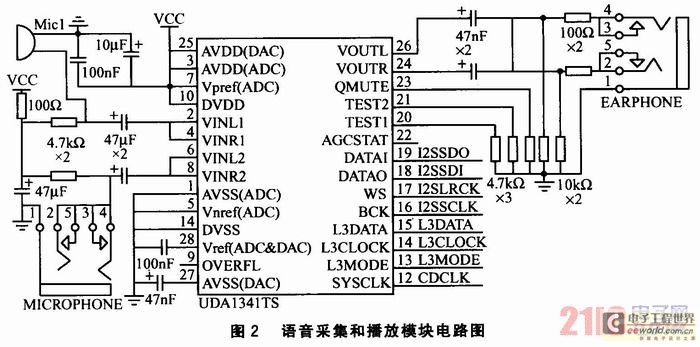 語音采集和播放模塊的作用是將音頻模擬信號轉(zhuǎn)換為數(shù)字信號,并對信號進(jìn)行PCM編碼。其電路如圖2所示。采用Philips公司的UDA1341 TS型立體聲音頻CODEC進(jìn)行音頻編解碼。該芯片提供2個麥克風(fēng)輸入,可實(shí)現(xiàn)單端輸入、差分輸入等靈活配置,并設(shè)置了可編程增益放大器和自動增益控制器,可保證高質(zhì)量的音頻獲;同時,還集成了聽筒和喇叭輸出的驅(qū)動器,喇叭音量可以通過編程調(diào)整。S3C2440A-40微處理器與UDA1341TS編解碼器通過I2S總線直接相連,并采用DMA發(fā)送/接收方式,完成系統(tǒng)的錄音和放音。