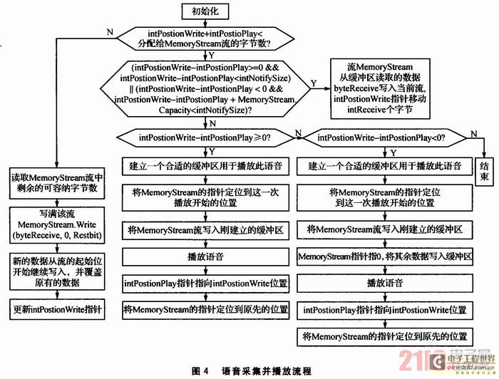從音頻編解碼器中獲取數(shù)據(jù)時,首先通過UDA1341TS采集語音信號放入語音捕捉緩存區(qū),應(yīng)用程序再從語音捕捉緩沖獲取語音信號并發(fā)送。具體程序流程如圖5所示。