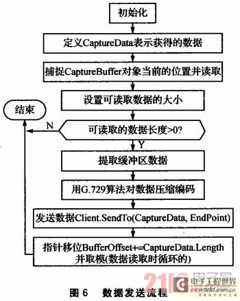 數(shù)據(jù)發(fā)送函數(shù)的作用是將語音捕捉緩沖區(qū)的數(shù)據(jù)通過Client.SendTo(CaptureData,EndPoint)函數(shù)發(fā)送到網(wǎng)絡(luò)上。當(dāng)線程發(fā)現(xiàn)有數(shù)據(jù)要讀取(即線程被觸發(fā))時,就會循環(huán)調(diào)用數(shù)據(jù)發(fā)送函數(shù),直到?jīng)]有可讀的數(shù)據(jù)為止。CaptureBuffer為語音捕捉緩沖區(qū)對象。數(shù)據(jù)發(fā)送流程如圖6所示。