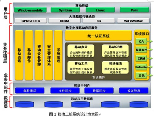 移動工單系統(tǒng)是在Windows Mobile智能手機(jī)操作系統(tǒng)上自主研發(fā),采用B/S和C/S混合架構(gòu),以TCP/IP作為基礎(chǔ)數(shù)據(jù)傳輸協(xié)議,通過移動通信網(wǎng)絡(luò)無線數(shù)據(jù)通道GPRS/EDGE/CDMA1x等,將呼叫中心的工單數(shù)據(jù)推送到智能手機(jī)上,由外勤服務(wù)人員將服務(wù)情況進(jìn)行實(shí)時的反饋。利用的同步中間件可將最新的資訊文件推送到手機(jī)終端上,服務(wù)人員無需登錄即可在終端可以查看最新的廣電資訊,可支持doc、xls、ppt等 Office文檔格式的瀏覽,支持WMV、WAV、3GP多種音視頻文件播放。服務(wù)人員可以不受地點(diǎn)和時間的限制通過終端實(shí)時獲取最新的多媒體客戶交互中心運(yùn)營數(shù)據(jù)報表,圖2為系統(tǒng)設(shè)計(jì)方案圖。