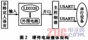 本文的語音識別方案是以嵌入式微處理器為核心,外圍加非特定人語音識別芯片及相關(guān)電路構(gòu)成。語音識別芯片選用ICRoute公司的LD33 20芯片。