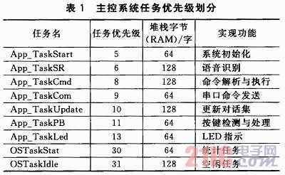 表1中除OSTaskStat和OSTaskIdle任務為系統(tǒng)自帶,其他7個任務均為用戶創(chuàng)建。App_TaskStart是系統(tǒng)的第一個任務,對系統(tǒng)時鐘和底層設(shè)備進行初始化,創(chuàng)建所有事件和其他各項用戶任務,并對系統(tǒng)狀態(tài)進行監(jiān)測;App_TaskSR完成語音識別;App_TaskCmd完成對話集中命令的解析和執(zhí)行,并通過USART1向外發(fā)送;App_TaskCom作為外圍擴展任務,通過USART2向外發(fā)送指令或數(shù)據(jù),負責控制外圍擴展設(shè)備,如語音合成設(shè)備等;
