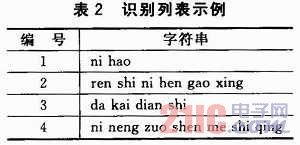 、趯懭胱R別列表。列表的規(guī)則是,每個識別條目對應一個特定的編號(1個字節(jié)),編號可以相同,可以不連續(xù),但是數(shù)值要小于256(00H~FFH)。本芯片最多支持50個識別條目,每個識別條目是標準普通話的漢語拼音(小寫),每2個字(漢語拼音)之間用一個空格間隔。本文中采取了連續(xù)不同編號的識別條目,表2是簡單的示例。