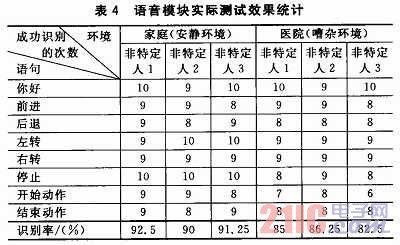 為了保證設(shè)計的語音識別模塊的語音識別率、穩(wěn)定性和響應時間,本文對所描述的語音識別模塊做了相應的測試,測試環(huán)境分別為安靜的家庭環(huán)境和嘈雜的醫(yī)院環(huán)境,共8條語音指令,對每條語音指令分別進行10次測試,每個環(huán)境下對每個特定人的總實驗次數(shù)為80次,記錄成功識別的次數(shù)。測試結(jié)果如表4所列。
