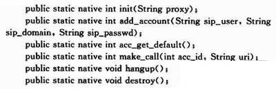 另一個很重要的函數(shù)是make_call,其在本接口文件中對應(yīng)的函數(shù)為Java_com_Android_IMSandroid_pjsip_make_lcall,這個函數(shù)一般在發(fā)起會話時調(diào)用,它與上一個函數(shù)在結(jié)構(gòu)上最大的不同在于本函數(shù)需要傳遞一個字符串參數(shù),前面提到,Java與C/C++在參數(shù)結(jié)構(gòu)上并不完全相同,因此這里需要將Java傳遞過來的String類型的參數(shù)轉(zhuǎn)化,可以通過“url_ptr=(char*)env-》GetStringUTFChars(url,&iscopy)”來實現(xiàn)。env-》GetStringUTFChars在“jni.h”中定義,其功能是將jsting類型(Java)的url復(fù)制到char*類型(C)的url_ptr中,以此來完成參數(shù)類型的轉(zhuǎn)換。