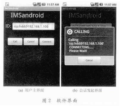 封裝后安裝到Android手機(jī)、MID或虛擬機(jī)中,并發(fā)起會話。與開源SIP軟件Linphone通信的結(jié)果如圖2所示。