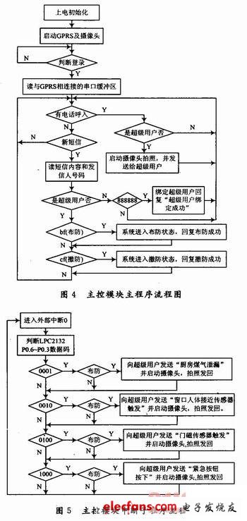在主控模塊主程序中系統(tǒng)一直在檢測是否有來電和新短信信息,當(dāng)有來電時系統(tǒng)會自動掛斷電話,然后判斷是不是超級用戶:是,啟動攝像頭拍照,并發(fā)送給超級用戶;不是,系統(tǒng)將不理睬,繼續(xù)檢測。當(dāng)是短消息時,判斷是否是超級用戶:不是,判斷短信內(nèi)容是“888888 ”否,是則系統(tǒng)綁定該號碼為超級用戶,并回復(fù)“超級用戶綁定成功”;是,判斷短信內(nèi)容是否是“bf”或“cf”,是“bf”系統(tǒng)進入布防狀態(tài),并回復(fù)“布防成功”,是“cf”系統(tǒng)撤防,回復(fù)“撤防成功”。