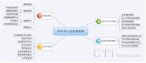 業(yè)務量預測的大體流程可分為數(shù)據(jù)清理、實施預測、預測準確性衡量、實時應急與調(diào)整等幾個步驟。每一步的詳細內(nèi)容請見下圖:
