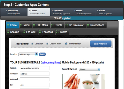 Bizness Apps采用可視化操作界面,用戶只需要點擊設(shè)置相關(guān)選項就能完成應(yīng)用的開發(fā)工作。因此,Bizness Apps很適合缺少專業(yè)技術(shù)人員的小企業(yè)開發(fā)本行業(yè)應(yīng)用。利用Bizness Apps開發(fā)行業(yè)應(yīng)用只需五步。首先,開發(fā)者選擇對應(yīng)的行業(yè)后,需要為應(yīng)用添加功能組件。第二步,為訂制好的功能組件添加內(nèi)容。第三步,為應(yīng)用選定外觀的設(shè)計方案。第四步,預覽經(jīng)過定制后的應(yīng)用。最后,完成付費后即可發(fā)布你的應(yīng)用。