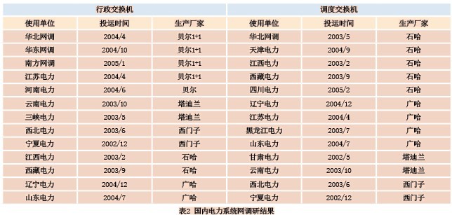 通過對目前國內(nèi)電力系統(tǒng)網(wǎng)省一級的用戶使用交換機(jī)設(shè)備品牌進(jìn)行電話調(diào)研統(tǒng)計,從整體上更能體現(xiàn)交換設(shè)備技術(shù)發(fā)展走向,為軟交換應(yīng)用的可行性評估提供可靠的數(shù)據(jù)。表2為重點(diǎn)調(diào)研的匯總結(jié)果。