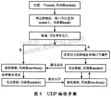 在本系統(tǒng)中,在一個網(wǎng)段內(nèi)的任意兩個應(yīng)用程序之間可以進(jìn)行全雙工通信,每個應(yīng)用程序既可做為服務(wù)器又可做為客戶端。其UDP編程步驟如圖6所示,以下是兩個應(yīng)用程序A和B之間進(jìn)行點對點通訊的具體實現(xiàn)過程: