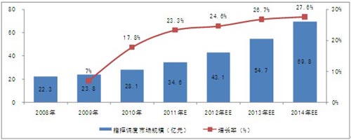 根據(jù)對下游行業(yè)的調(diào)研和關(guān)聯(lián)市場的分析,2010年,中國指揮調(diào)度市場規(guī)模已達到28.1億元。隨著下游行業(yè)投資規(guī)模的擴大、產(chǎn)品的升級換代及技術(shù)的發(fā)展,行業(yè)市場規(guī)模將保持較快的增長速度,未來4年的復(fù)合增長率為26.31%,2014年,市場規(guī)模將達到69.8億元。