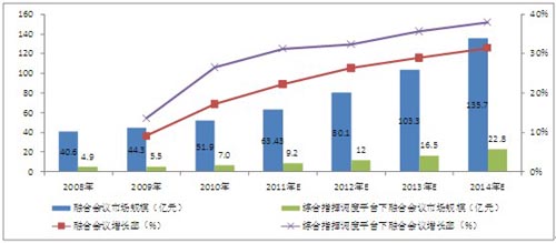 圖表 5 2008-2014年中國融合會議市場規(guī)模及增長率