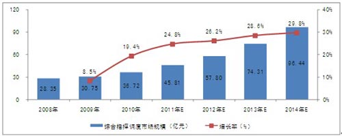 受市場的推動,未來幾年我國綜合指揮調(diào)度系統(tǒng)建設(shè)的范圍將逐步擴大。2011到2014年,我國綜合指揮調(diào)度市場的復(fù)合增長率將達到28.16%,2014年市場規(guī)模將達到96.44億元。