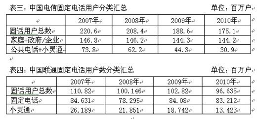 從表中可以看出,中國(guó)電信每年的固定電話用戶總數(shù)持續(xù)下降,下降速度最快的是小靈通業(yè)務(wù),剔除小靈通和公共電話業(yè)務(wù),中國(guó)電信的固定電話用戶量實(shí)際上一直穩(wěn)定在1.4億戶以上,中國(guó)聯(lián)通公司的固定電話用戶量則一直穩(wěn)定在8000萬(wàn)戶以上。