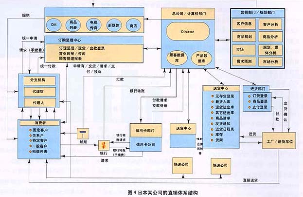 ——圖4示意了日本某家大型通信公司的體系結(jié)構(gòu)。一般來(lái)說(shuō),直銷(xiāo)體系由以下幾大環(huán)節(jié)構(gòu)成: