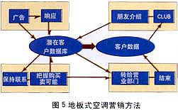 ——銷(xiāo)售支持:東京煤氣公司擁有三種主要的家用產(chǎn)品:地板式空調(diào),煤氣暖氣及煤氣衣服干燥機(jī)。此公司于1993年開(kāi)始運(yùn)用數(shù)據(jù)庫(kù)營(yíng)銷(xiāo),現(xiàn)已取得了驕人的成果。其中主力產(chǎn)品——地板式空調(diào),盡管周期長(zhǎng)、價(jià)格高,1997年一年就銷(xiāo)售了3萬(wàn)6千套,同時(shí)從對(duì)這些用戶調(diào)查的結(jié)果發(fā)現(xiàn)“滿意”的占96%。下面介紹一下“地板式空調(diào)”的營(yíng)銷(xiāo)方法(見(jiàn)圖5)