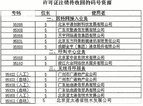 信產(chǎn)部公告稱(chēng),對(duì)這次經(jīng)營(yíng)許可證注銷(xiāo)涉及的13個(gè)號(hào)碼,將依據(jù)《電信網(wǎng)碼號(hào)資源管理辦法》(信息產(chǎn)業(yè)部令第28號(hào))將予以收回。(高飛)