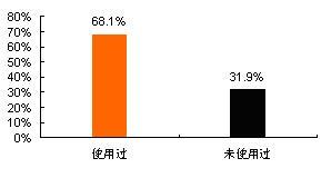 調(diào)查數(shù)據(jù)顯示,在所訪問6個(gè)城市的手機(jī)用戶中,已使用過數(shù)據(jù)增值業(yè)務(wù)(包括已使用過短信業(yè)務(wù)或已使用過其它業(yè)務(wù)的)的用戶占總體的68.1%,而還未使用過數(shù)據(jù)增值業(yè)務(wù)的占總體的31.9%。如下圖所示: