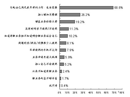 調(diào)查發(fā)現(xiàn),目前制約手機(jī)用戶使用更多數(shù)據(jù)增值業(yè)務(wù)的原因主要是:“打電話已經(jīng)滿足目前的工作/生活需要”(占68.6%)、“擔(dān)心增加消費(fèi)額”(占26.2%)、“增值業(yè)務(wù)價(jià)格太貴” (占19.2%)、“沒有時(shí)間學(xué)習(xí)使用/不會(huì)用”(占11.3%)、“知道有新業(yè)務(wù)但不知道哪些新業(yè)務(wù)適合自己”(占10.2%)等。