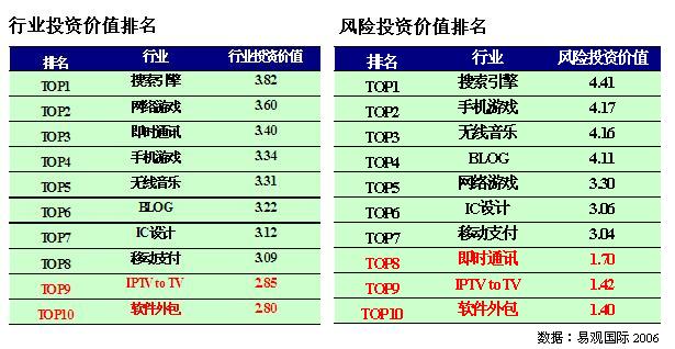 3G 牌照的發(fā)放,手機(jī)游戲、無線音樂、移動(dòng)支付、博客等行業(yè)投資潛力都將有所提高,其中手機(jī)游戲、無線音樂和博客分別列居第二、第三、第四,成為未來三年中高增長行業(yè)。即時(shí)通訊行業(yè)投資價(jià)值排名第三,由于其商業(yè)模式的低創(chuàng)新,致使其風(fēng)險(xiǎn)投資價(jià)值僅為倒數(shù)第三,不具備風(fēng)險(xiǎn)投資價(jià)值。隨著汽車行業(yè)、消費(fèi)電子行業(yè)逐步向智能化、數(shù)字化發(fā)展,IC